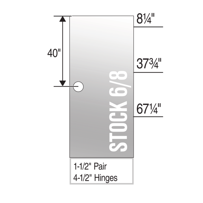 - Hinge Locations (Top of Door to Top of Hinge): 8-¼", 37-¾", 67-¼"